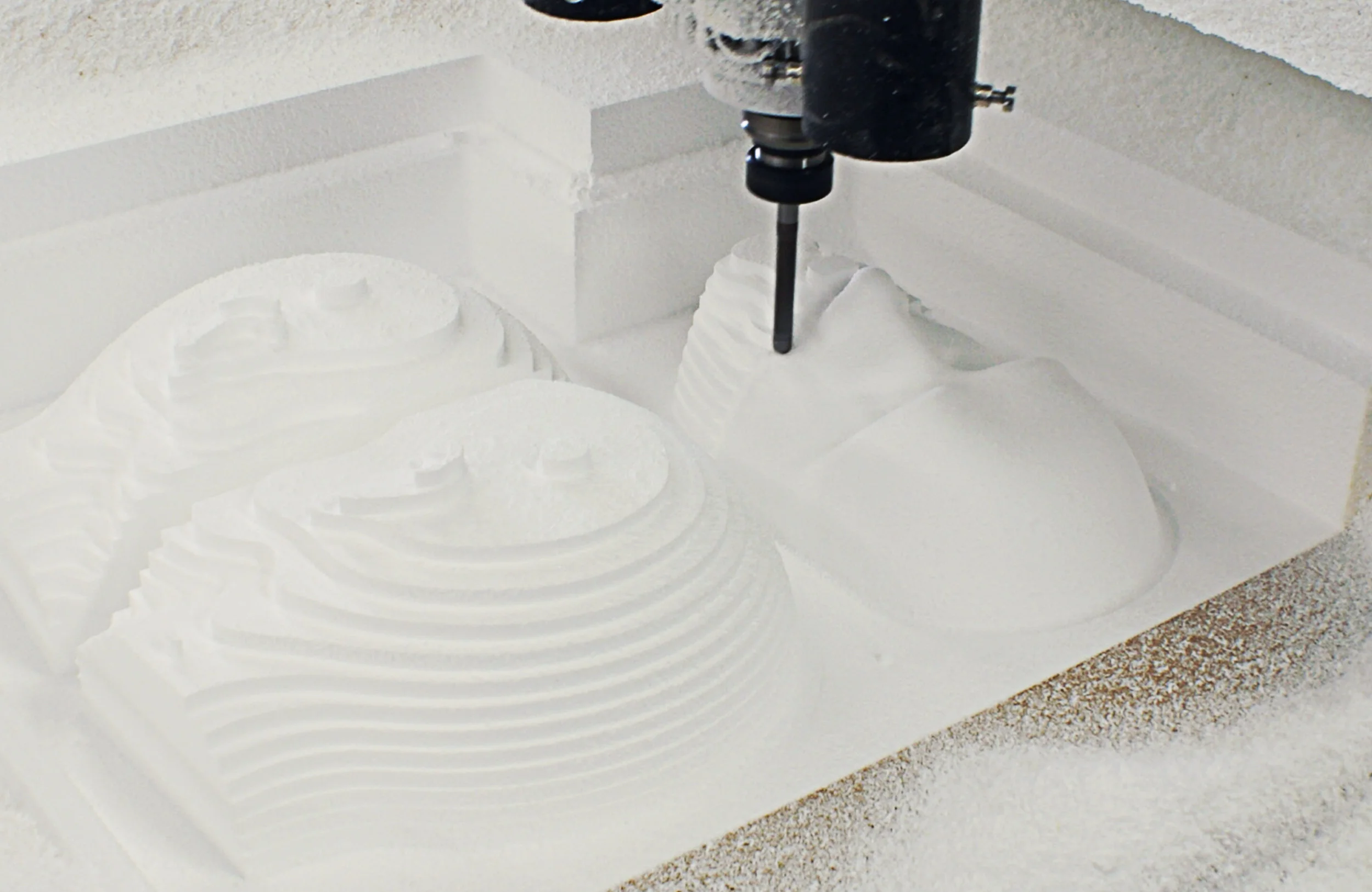 High density foam topo models with natural or expressed contours, large foam and MDF bucks for vacuum forming, large plywood and MDF parts for 1:1 mockups